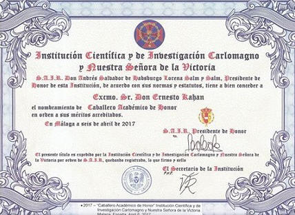 España. El diploma que lo honra como Caballero Académico fue rubricado por el Presidente de Honor de esta