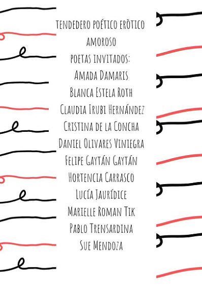 El Tendedero Poético Amoroso Erótico organizado por Claudia Irubí Hernández con el apoyo de Jade Molinero y con motivo del 14 de febrero, tuvo lugar en la Sala de Arte Fernando Montes de Oca, en Azcapotzalco, el día 16 del mes del amor y la amistad. Poetas y escritores se reunieron para una lectura poética y así festejar este día de San Valentín en la ciudad de México. Y los textos leídos pendieron de un tendedero. Sus autores: Felipe Gaytán Gaytán, quien lamentablemente falleciera tres meses después, Hortensia Carrasco, Cristina de la Concha, Blanca Roth, Amada Damaris, Lucía Jaurídice, Marielle Roman Tik, Pablo Trensardina, Sue Mendoza y la misma organizadora Claudia Irubí Hernández.