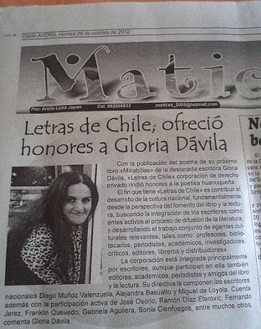 la Exposición Fotográfica El Rito entre sombras de Iván Hernández Trejo en la comunidad de Santa Ana Tzacuala, Acaxochitlán, y Santiago Tulantepec y viaja un segmento de esta muestra por varios países de Sudamérica, sin faltar Argentina. Ahora, con mucho pesar por no poder asistir al 1er Festival de Lectura que organiza la poeta Maryángel Gasca en su querida Agua Dulce, Veracruz, enviándole nuestros mejores de deseos, que su festival sea un éxito, felicitándola por esta iniciativa (¡vamos en aumento en las acciones por la lectura!). Y, expectante, espero el inicio del 4º Festival Internacional de Poetas 'Antenor Samaniego', en Huari, Perú, que organiza la Casa del Poeta Peruano encabezado por el peruano José Vargas, ya llena de oxígeno limeño y agradecida por las atenciones de la Casa del Poeta Peruano, experiencia de lectura, arte u poesía que compartiré con mis compatriotas los poetas Samuel Ronzón y Eduardo Hidalgo Trujillo y en la que extrañaré a Alex Campos, representante en México de esta institución que lamentablemente no podrá participar. |